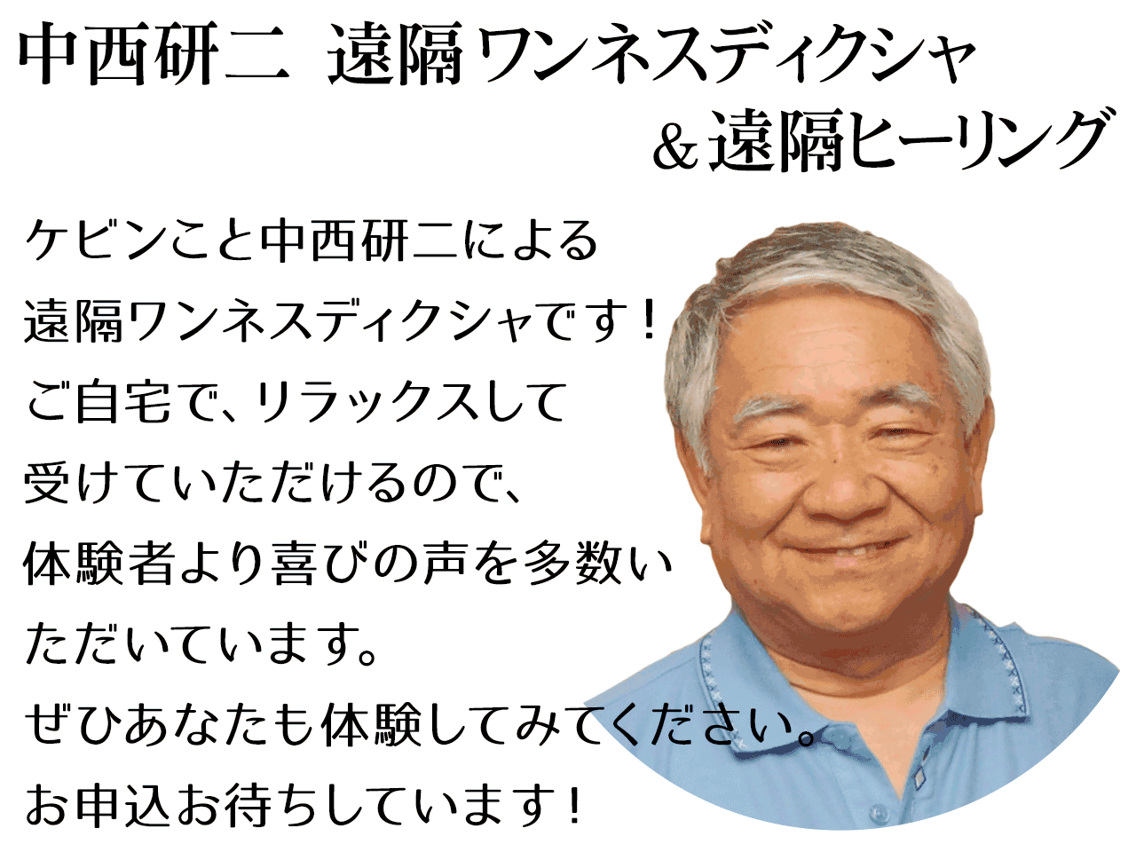 【遠隔ワンネスディクシャ&ヒーリング】については、現在お申し込み頂いている分も含め、既に中西功がケビンより引継ぎ、実施しております。今後も、中西功がケビン同様に行ってまいりますので、ご安心ください。